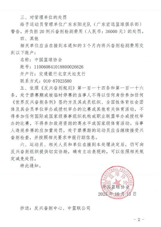 雷速体育10月13日讯 根据中国篮协官方的公示,对于上个赛季效力广东队大外援吉伦沃特兴奋剂违规处理结果正式公示。 吉伦沃特提供相关资料证实与运动能力无关,最终被罚禁赛三个月,广东队具有连带管理等责任,负责36000检测费,队医林直达给与警告处罚。 具体公告如下: |