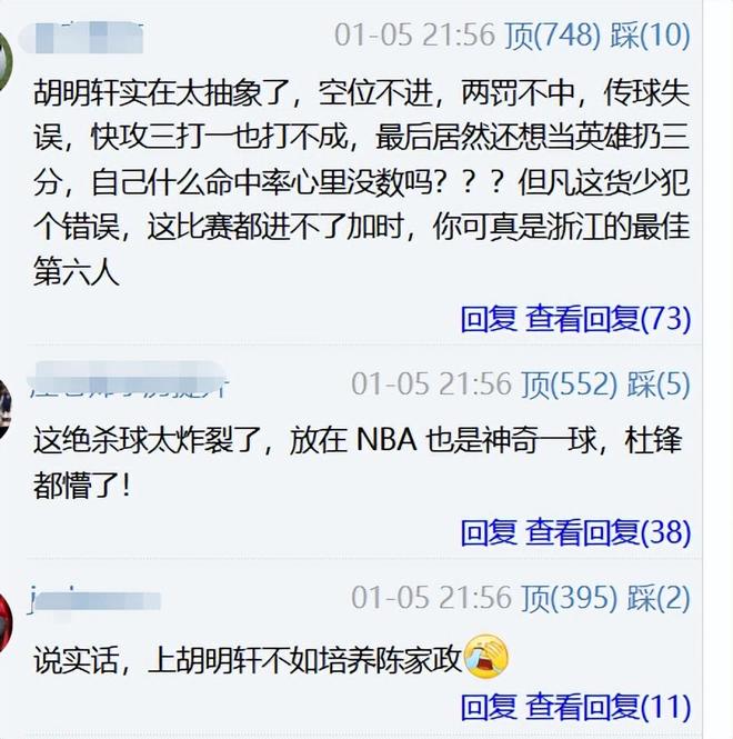 还有位球迷的长文点评说的特别真实且扎心:每次广东上半场、前三节领先对手十几二十分,之后上胡明轩就会被对手追上来;不管球队输赢,胡明轩的正负值几乎都是负的,广东基本领先大比分后上胡明轩,球队都是输分的,因为每球都是交给胡明轩为轴做进攻发起点,到最后时间走了大半,传球几乎毫无爆发力,还很随意,队友接球很不舒服,而且容易被断。 不可否认胡明轩过去几个赛季对广东队做出的贡献,但眼下的胡队早已不是当初的自己了,杜锋应该要认真重视这一点了,胡明轩有伤就真的别让他再打了,早点让陈家政转正上先发才是眼下的最优解。