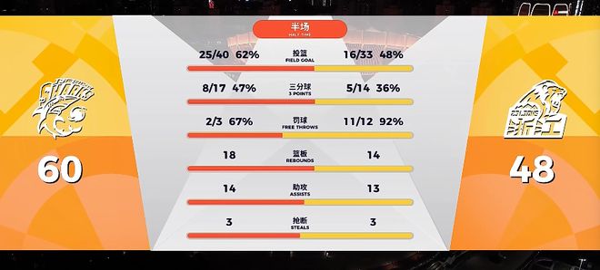 上半场最后时刻,刘铮和古德温接连命中三分!第二节结束,上海男篮以60-48领先对手12分进入更衣室。