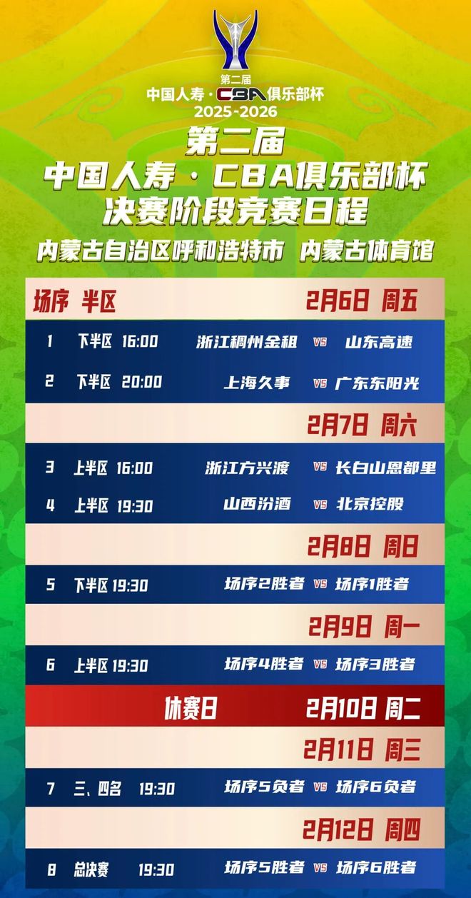 今天下午,CBA联赛官方也发布了本届CBA俱乐部杯决赛阶段的竞赛日程。上海久事男篮将在2月6日晚间对战广东东阳光男篮。