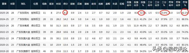新赛季至今,胡明轩场均得到8.2分创造过去7年的新低,场均三分命中率跌至23.9%,罚球命中率只有61.1%,创造职业生涯新低。