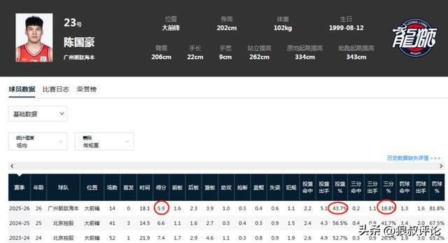 赛季至今0首发!陈国豪登场19分钟得0分多项数据不如效力北控期间