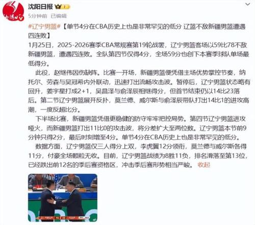 “媒体都看不下去,《沈阳日报》标题直接扎心,单节4分确实罕见。”