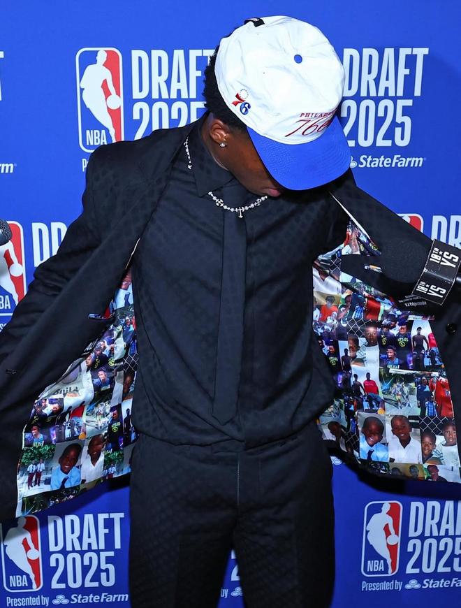 选秀时,埃奇库姆还穿了一件特别定制的西装,里面贴满了自己和家人,还有和‘糖’教练的照片。