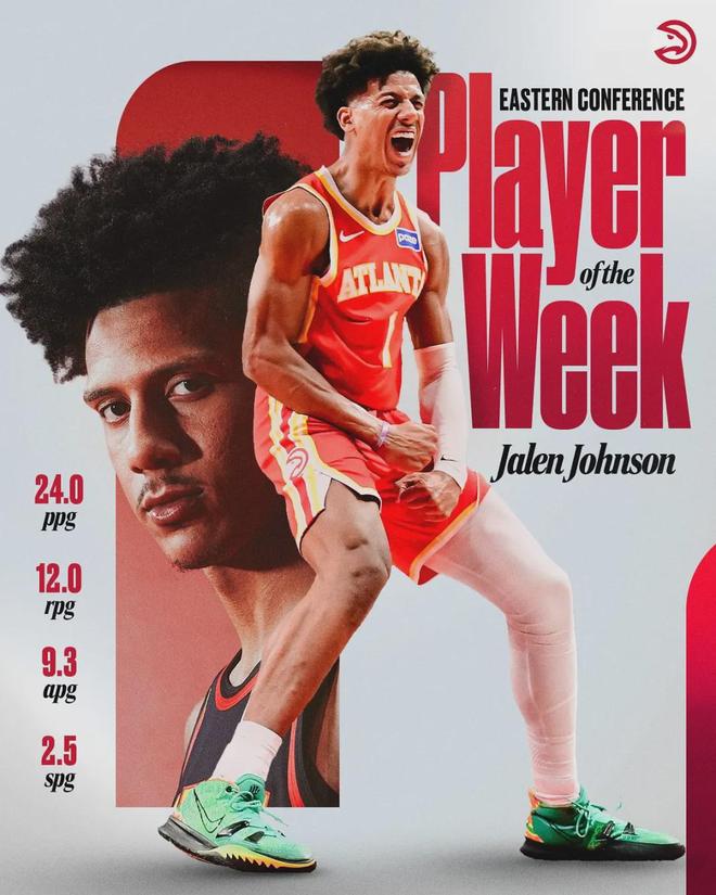 11月份,杰伦-约翰逊成为整个联盟状态最火热的球员之一。 上周他场均24分12篮板9.3助攻2.5抢断率队取得4连胜,凭借优异的表现生涯首次当选周最佳。 其中对阵爵士的比赛,他在上半场便12投7中、三分3中3轰下20分5篮板8助攻5抢断,成为NBA历史上首位半场至少拿到20分5篮板5助攻5抢断的球员。 那场比赛,他的数据最终定格在31分18篮板14助攻7抢断,四项数据全部创造生涯新高,他也成为NBA历史上首位单场至少砍下31分18篮板14助攻7抢断的球员。