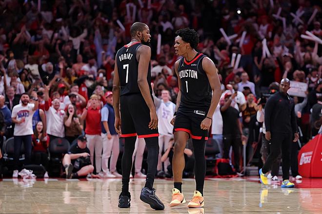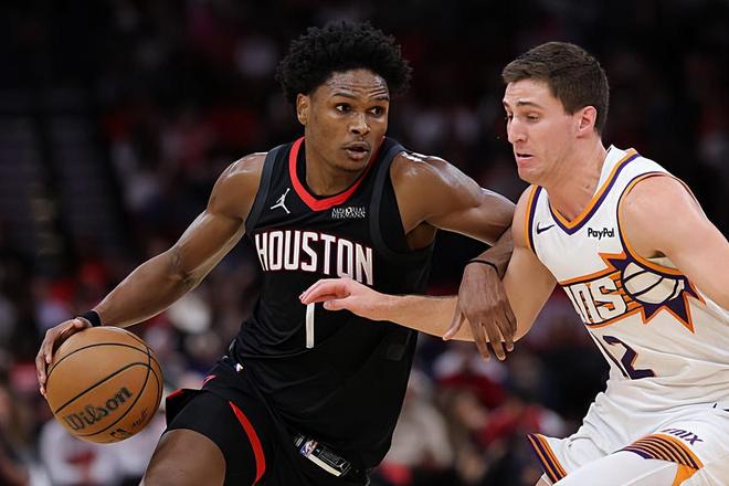本场比赛中,火箭的先发控卫阿门-汤普森(Amen Thompson)的表现多多少少是有些一般的。阿门全场出场37分10秒,投篮13中5,罚球7中7,得到了17分7篮板6助攻的数据,还有3次失误和4次犯规,正负值为-7。阿门在本场比赛中显然是没有发挥出自己的最大价值的,他在进攻端的效率并不理想,他并没有将自己在冲击力和爆发力方面的优势发挥出来,他也依然没有展现出任何的投射能力。阿门能够起到一定的传球和组织方面的作用,但是他在这方面的能力也绝对达不到一名合格的先发控卫的水平。事实上,阿门在防守端的表现也是比较一般的,他也没有展现出自己应有的防守能力。总体来看,阿门在本场比赛中在攻防两端的作用都不太突出,他本应该做得更好才对。