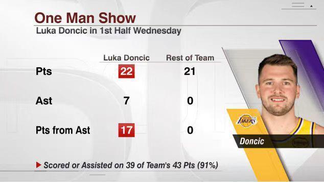 东契奇肩负起单核带队的重任,面对文班亚马领衔的马刺团队攻势,湖人前两节持续被马刺压制处于微弱落后局面,首节湖人仅23-26落后马刺3分,第二节单节20-22再输2分,上半场结束湖人43-48落后马刺。 东契奇前两节比赛首发登场20分08秒全队最多,他贡献14中7的5成准星,其中外线三分5中1低迷,也是湖人全队三分20中4低迷的缩影。所幸,东契奇还不断造犯规罚球10中7,上半场已经得到22分7篮板7助攻2抢断的准三双数据,且在场正负值+2,成为湖人唯一得分上双的球员。