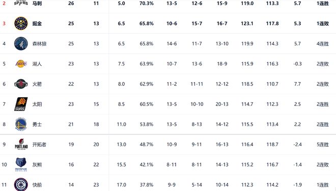 根据西部最新的排名情况,雷霆在以一分险胜灰熊之后,球队遥遥领先。那么剩下的10支球队将成为季后赛+附加赛的竞争者,并且在西部前七位的争夺中,战况特别激烈。 马刺在此前击败湖人之后,球队目前26胜11负,排名西部第二位,掘金目前由于约基奇缺阵,战绩有些下滑,他们排名西部第三位,但是排名并不稳,很有可能被身后的森林狼追上。