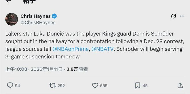 施罗德被禁赛将从明天对阵火箭开始,三场比赛让他损失29.2万美元。大家对这笔罚单有两个疑问:1、两周前的比赛,为啥现在才公布处罚结果?2、施罗德想殴打的湖人球员是谁?Chris Haynes补充报道,这个湖人球员是东契奇