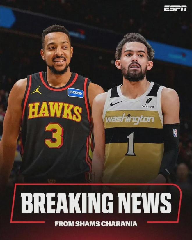 前两天,老鹰将特雷杨送至奇才,交易回CJ-麦科勒姆和科里-基斯珀特。