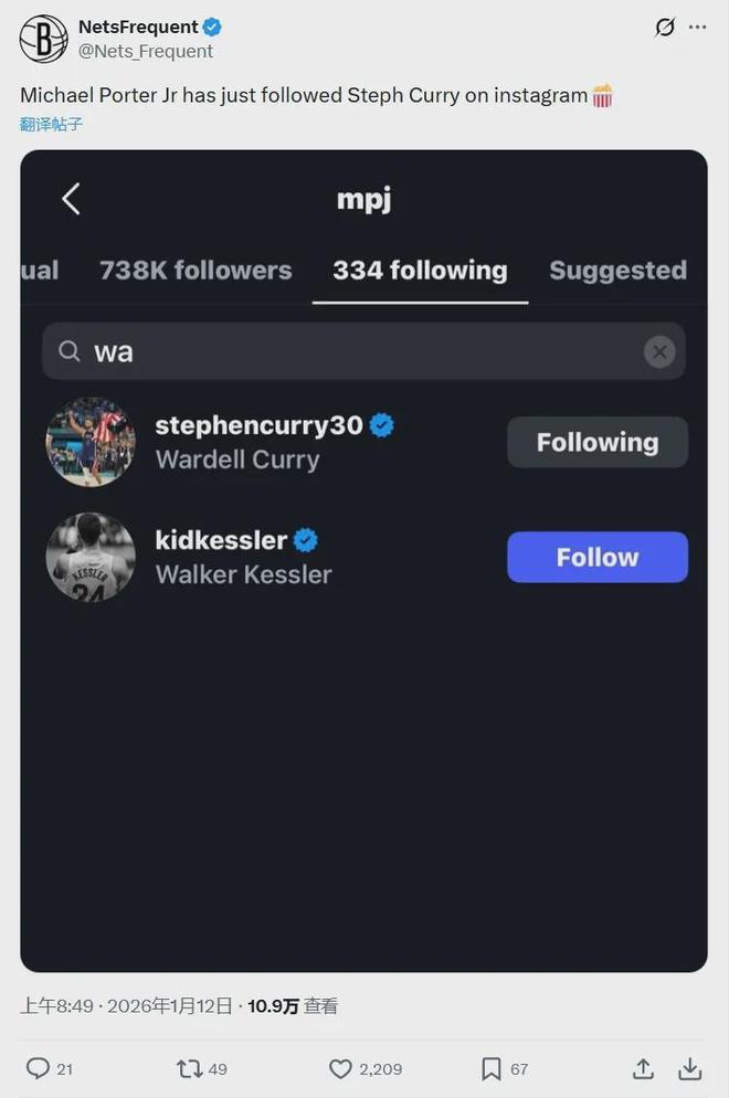 小波特已经在个人社媒上关注了库里......