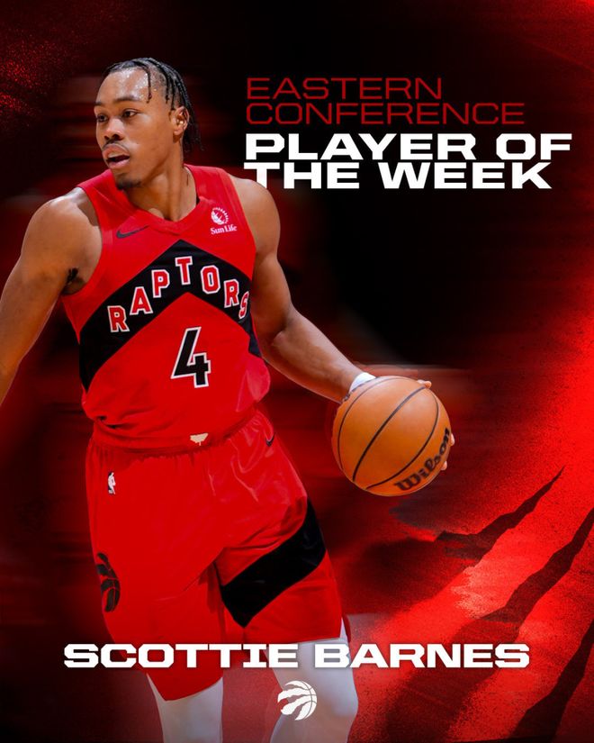 对老鹰一战,巴恩斯18分8篮板10助攻;对黄蜂一战,巴恩斯17分4篮板1抢断1盖帽;对76人一战,巴恩斯31分7篮板8助攻,上演罚球准绝杀。 赛季至今,巴恩斯场均19.4分8.4篮板5.3助攻,投篮命中率50.5%。猛龙24胜16负,暂列东部第四。 其他被提名球员为: 西部:阿夫迪亚(开拓者)、布克(太阳)、爱德华兹(森林狼)、亚历山大(雷霆)、小卡(快船); 东部:布伦森(尼克斯)、恩比德(76人)、加兰(骑士)、杰伦-约翰逊(老鹰)、内姆哈德(步行者) |