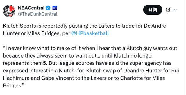 富保罗出手了!正推动亨特交易去湖人布里奇斯也可能加盟紫金军
