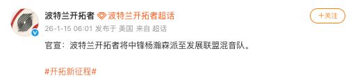 1月15日,@波特兰开拓者 宣布,将中锋杨瀚森派至发展联盟混音队。