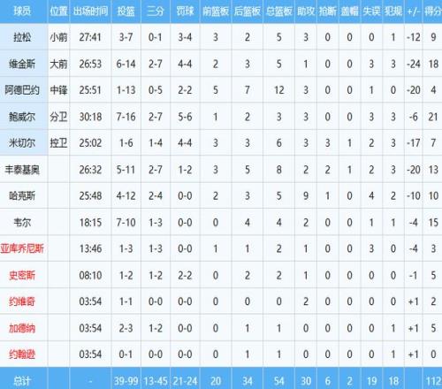 作为人类18分精华的维金斯,上半场18分,下半场0分,最终全场投篮14中6,其中三分7中2,罚球4中4拿下18分5板1助,正负值-24全场最低。