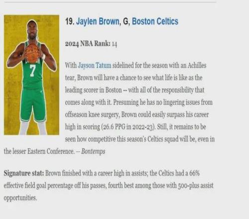 但平心而论,以目前凯尔特人的整体实力想要竞争冠军难度很大,在最检验球队硬实力的关键时刻(比赛最后5分钟双方分差5分)方面,凯尔特人就出现了球员整体实力不足的缺陷,目前球队有21场比赛进入关键时刻,最终战绩是9胜12负,布朗参与了其中20场,他的关键时刻总得分57分排名队内第1,德里克-怀特49分排名队内第2,但第3的普理查德仅25分,也就是说球队一旦进入到竞争级别更高的比赛中,凯尔特人的阵容厚度薄就暴露无遗,布朗显得独木难支.