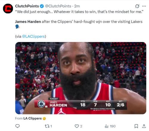 快船近17战14胜!21中6+7失误在场却净胜13分哈登:我们还能进步
