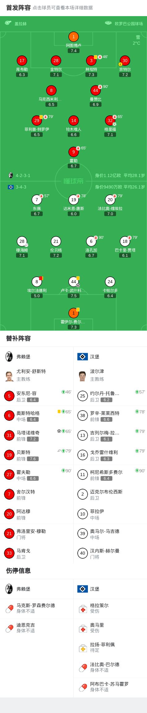 北京时间1月10日德国足球顶级联赛 联赛 第16轮,弗赖堡主场对阵汉堡。弗赖堡格里福破门,马塔诺维奇破门。汉堡卢卡-武什科维奇破门。最终比分弗赖堡 2-1 汉堡。