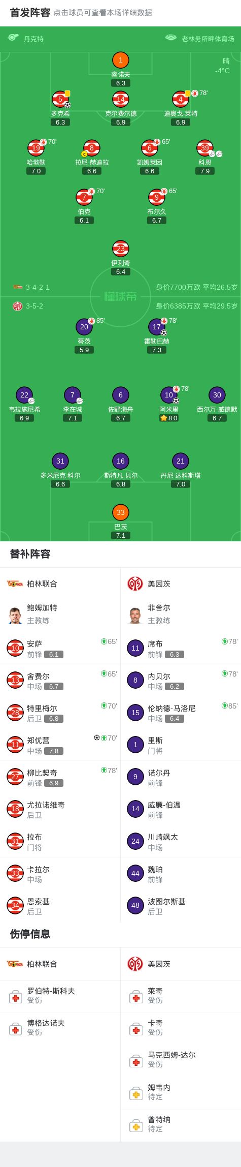 第30分钟,美因茨球员李在城助攻阿米里打入一球。 第69分钟,美因茨球员韦拉施尼希助攻霍勒巴赫打入一球。 第77分钟,柏林联合球员科恩助攻郑优营打入一球。 第86分钟,柏林联合球员柳比契奇打入一球。 球队阵容