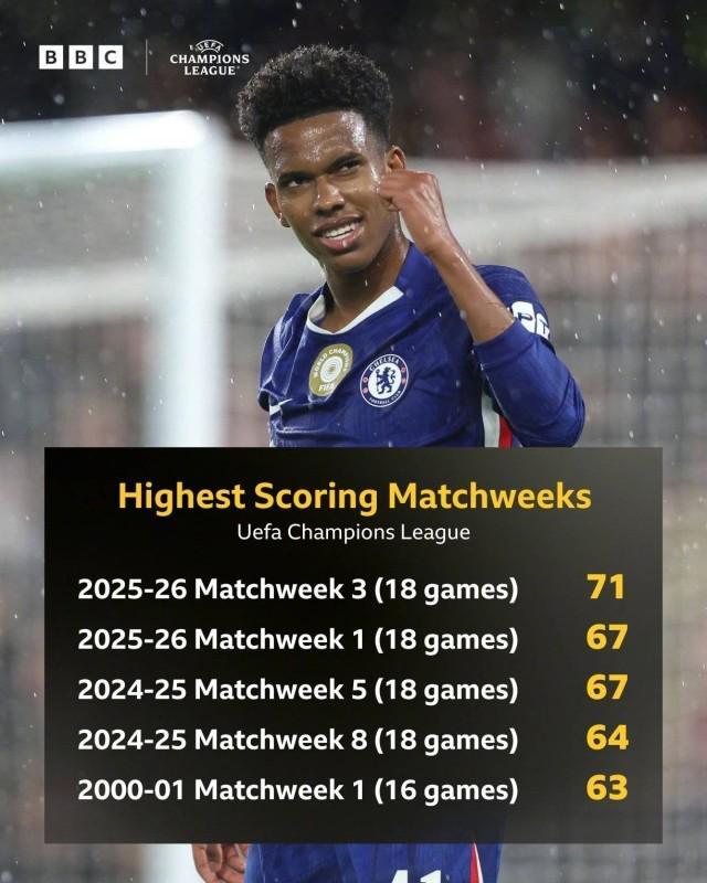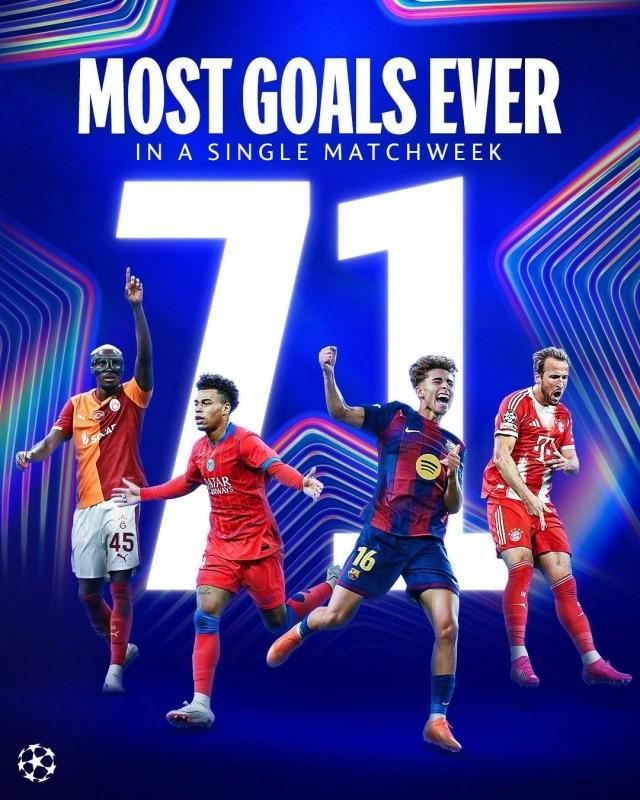 欧冠联赛阶段第3轮,18场比赛共打进了71个进球(场均3.9444),创了欧冠单轮历史进球纪录,刷新本赛季第1轮和上赛季第5轮67球的数字。32强小组赛时代,最高的纪录则是16场63球(场均3.9375) 有观点认为,上赛季冠军巴黎也是靠附加赛晋级淘汰赛的,所以大家都不保守了,无所谓了,联赛阶段随便玩了。 同时本轮强强对话不多,也一定程度上造成了大比分频发。