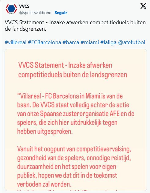 荷兰球员联盟发文抵制西甲海外联赛:这种行为应永久被禁止