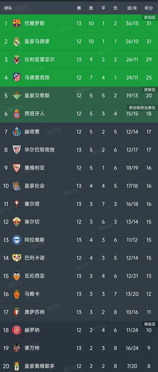 西甲第13轮结束了5场比赛,最新积分榜如下!