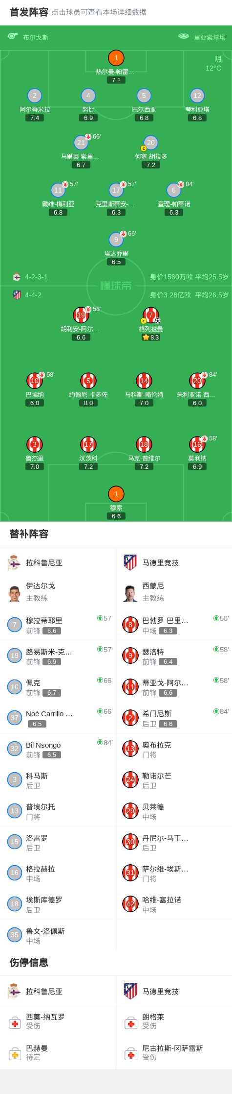 第58分钟,阿尔马达、瑟洛特、巴里奥斯上,巴埃纳、阿尔瓦雷斯、莫利纳下
