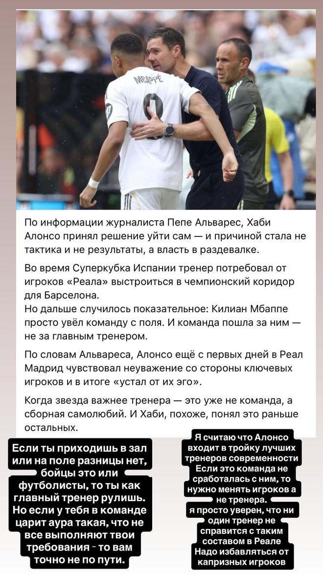 随后,小鹰又转发了一则新闻截图,新闻内容为:据记者佩佩-阿尔瓦雷斯透露,哈维-阿隆索是主动决定辞职的,原因并不是战术或成绩,而是更衣室的权力问题。在西班牙超级杯期间,主教练要求皇马球员为巴塞罗那列队。据称,阿隆索从加盟皇马的第一天起就感受到自己没有受到核心球员的尊重,最终阿隆索厌倦了他们的自我。当球星比教练更重要时,这已经不是一支球队了,而是‘自负者的集合体’。哈维似乎比其他人更早地意识到了这一点。 在报道下,小鹰评论道:“如果你走进训练场或球场都无所谓。无论是格斗选手还是足球运动员,主教练是掌控全局的,但要是你的团队中,弥漫着这样的氛围:并不是所有人都执行你的要求,那么你们注定无法同行。” “我认为阿隆索是当今世界足坛三大最佳主帅之一,如果球队与他配合不佳,就该更换球员,而不是主教练。我确信没有任何一位教练能驾驭得了皇马这样的阵容,必须清除任性的球员才行。” |