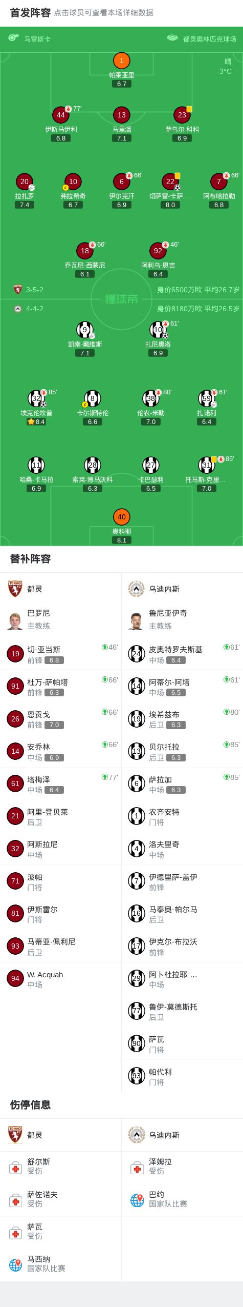 第50分钟,乌迪内斯球员扎诺利助攻扎尼奥洛打入一球。 第82分钟,乌迪内斯球员凯南-戴维斯助攻埃克伦坎普打入一球。 第87分钟,都灵球员拉扎罗助攻切萨雷-卡萨代伊打入一球。 球队阵容