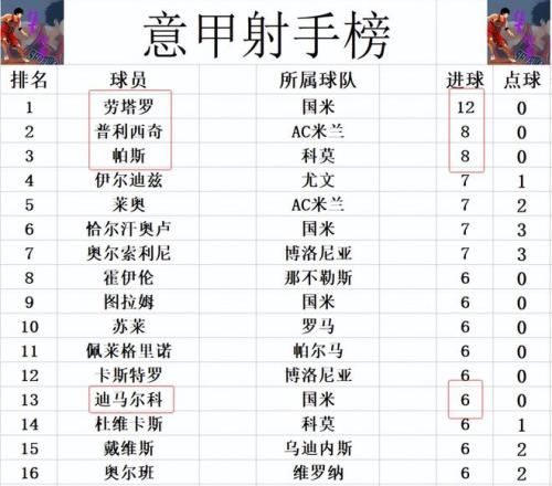射手榜方面,劳塔罗今天又打入一球,12球继续领跑,比第2的普利西奇,帕斯多了4球。迪马尔科今天1射2传造3球,追上图拉姆,苏莱,霍伊伦等人6球刚好挤入前十。 |