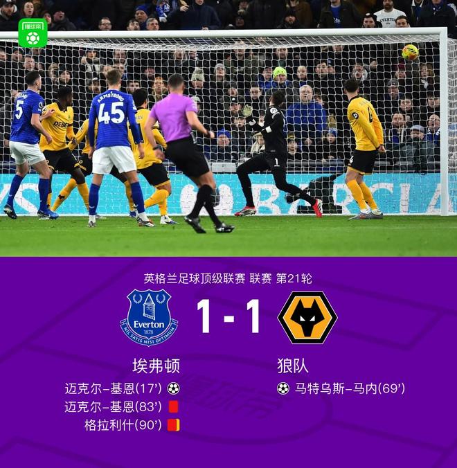 九人埃弗顿11狼队,基恩破门+染红,格拉利什染红,马内建功