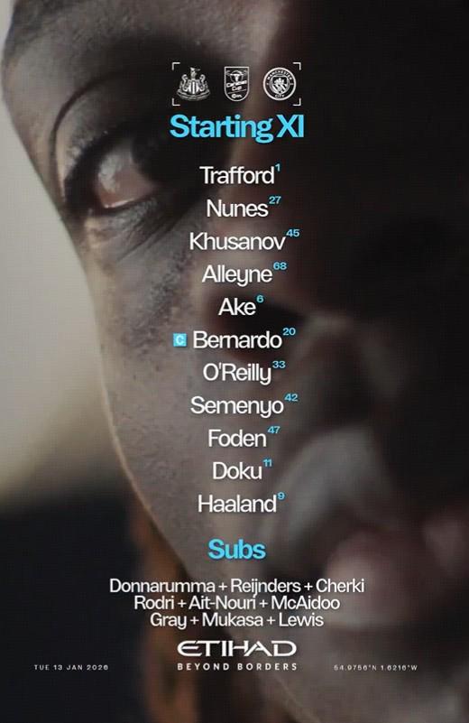 曼城首发:1-特拉福德、27-马特乌斯-努内斯、45-胡桑诺夫、68-马克斯-阿莱恩、6-阿克、20-伯纳多-席尔瓦、33-尼科-奥赖利、42-塞门约、47-福登、11-多库、9-哈兰德 替补:25-多纳鲁马、4-赖因德斯、10-谢尔基、16-罗德里、21-艾特-努里、56-瑞安-麦卡杜、59-查理-格雷、63-穆卡萨、82-里科-刘易斯 纽卡斯尔联首发:1-波普、3-刘易斯-霍尔、12-马利克-佳夫、4-博特曼、67-刘易斯-米利、39-吉马良斯、41-雅各布-拉姆齐、7-乔林顿、9-维萨、23-雅各布-墨菲、10-安东尼-戈登 替补:32-拉姆斯代尔、2-特里皮尔、8-托纳利、11-哈维-巴恩斯、20-埃兰加、27-沃尔特马德、28-约瑟夫-威洛克、37-亚历克斯-墨菲、62-肖恩-尼夫