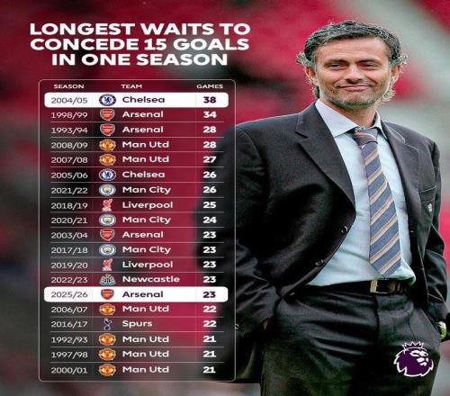 英超第23轮,阿森纳主场对阵曼联,上半场战罢比分为1-1,至此,阿森纳本赛季英超已丢了15球,这意味着切尔西在2004-05赛季创下的单赛季英超最少丢球纪录又保住了。