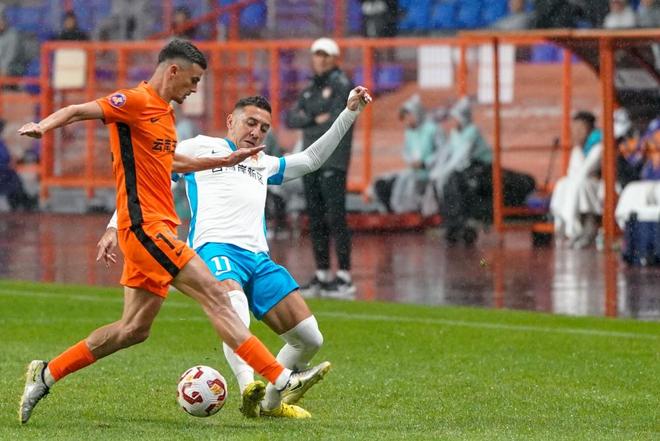11月2日,云南玉昆队球员内内(左)与青岛西海岸队球员戴维森在比赛中拼抢。新华社记者 彭奕凯 摄 (来源:新华社)  |