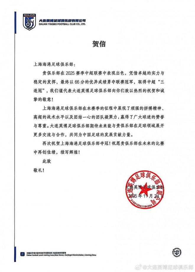 最后一段有一句有点哪壶不开提哪壶的意思!上面写道:祝愿海港“在亚洲赛场展现中国足球的风采”[我想静静]。目前海港在亚冠积分榜上排名倒数第一,中超跟亚冠排名倒挂,不知道这支中超新军是不是鼓励海港在亚冠赛场有所作为。此前,重庆铜梁龙冲超成功,贺电当中就有一封是来自海港,此次也算是投桃报李礼尚往来吧! 第二个向海港发出贺电的中超俱乐部也站出来了!他们就是本赛季中超末轮海港的对手——大连英博。这场比赛海港1比0战胜大连英博,有惊无险地捧起了冠军奖杯。