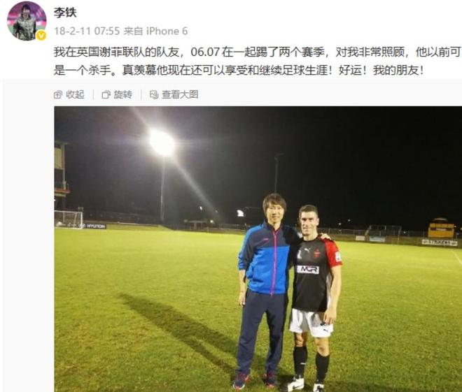 2018年冬训,当时李铁担任武汉卓尔主帅,率队在澳大利亚进行热身赛。第六场热身赛,武汉卓尔4-1击败卧龙岗狼队,李铁与谢菲联老队友尼克-蒙哥马利相逢,当时蒙哥马利还未退役,效力的正是武汉卓尔热身赛对手卧龙岗狼队。李铁在社媒晒出合照,他写道:“我在英国谢菲联队的队友,06.07在一起踢了两个赛季,对我非常照顾,他以前可是一个杀手。真羡慕他现在还可以享受和继续足球生涯!好运!我的朋友!”事实上,在谢菲联效力时期,蒙哥马利和孙继海也是队友。 更有意思的是:蒙哥马利效力澳超中央海岸水手期间,在亚冠赛场曾经与北京国安有过交锋,当时代表国安出战的张稀哲,还曾经在球场上放倒了自己的现任主帅。这也算是不打不相识吧! |